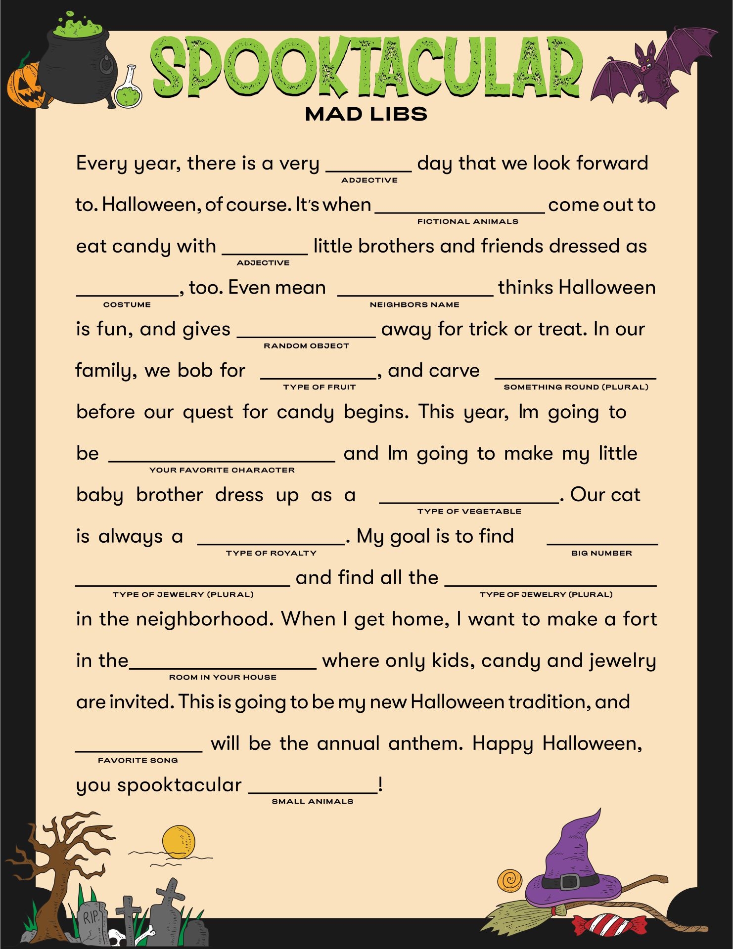 With themes ranging from haunted houses to trick-or-treating adventures, our Free Printable Halloween Mad Libs offer endless entertainment for all ages. Simply print out the templates, grab a pen or pencil, and get ready to fill in the blanks with silly words!
