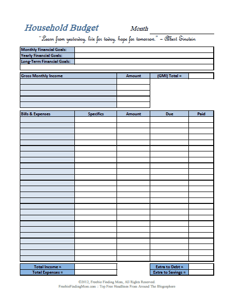 Free Printable Monthly Household Budget Sheet
