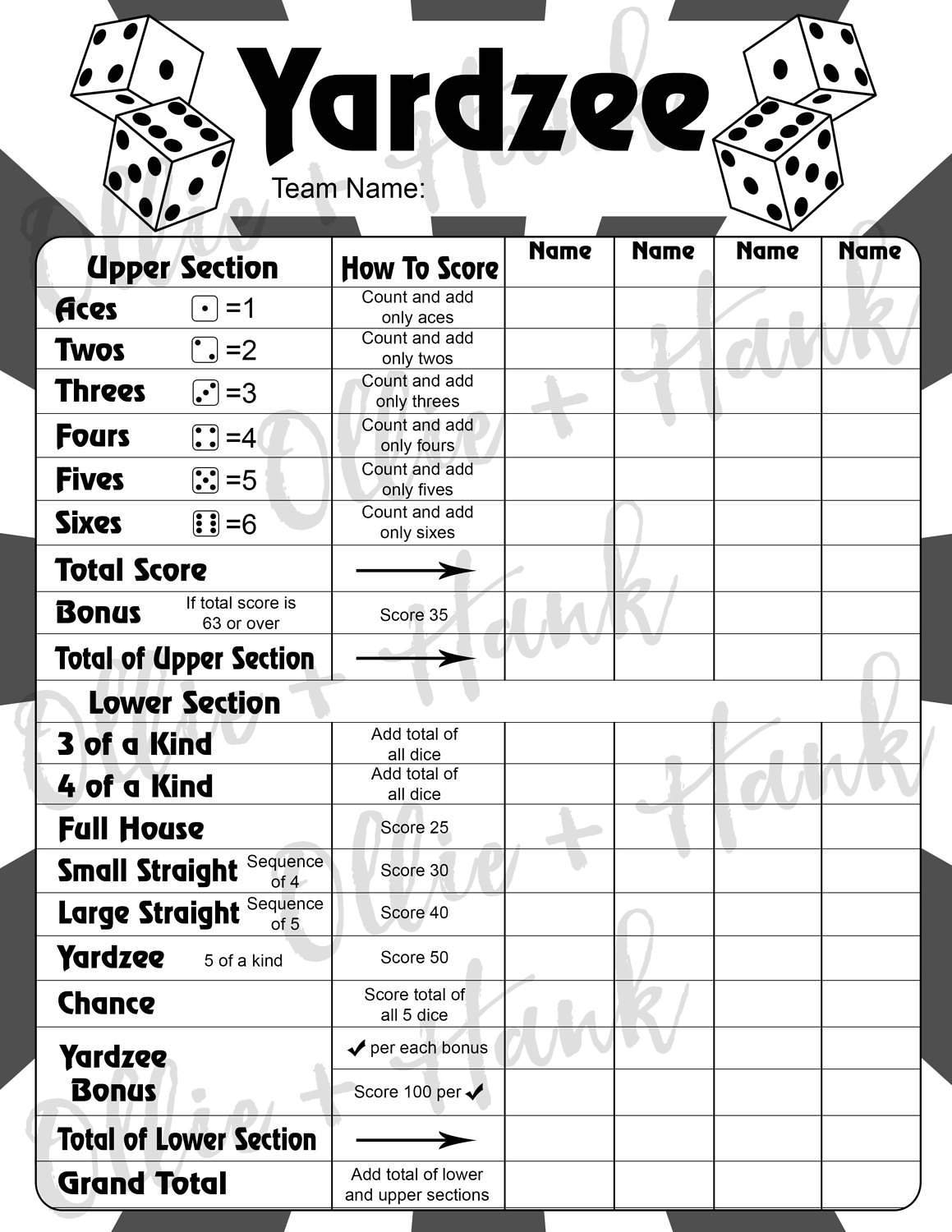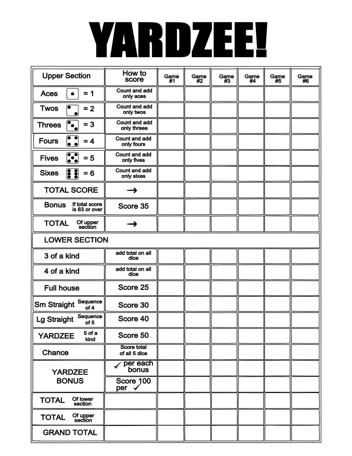 Yardzee Score Card Yardzee Score Sheet Yard Yahtzee