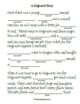 Simply fill in the blanks with nouns, verbs, adjectives, and more to create your own personalized Harry Potter story. Once you’ve completed all the blanks, read the story aloud and prepare to be entertained by the wacky and whimsical results!