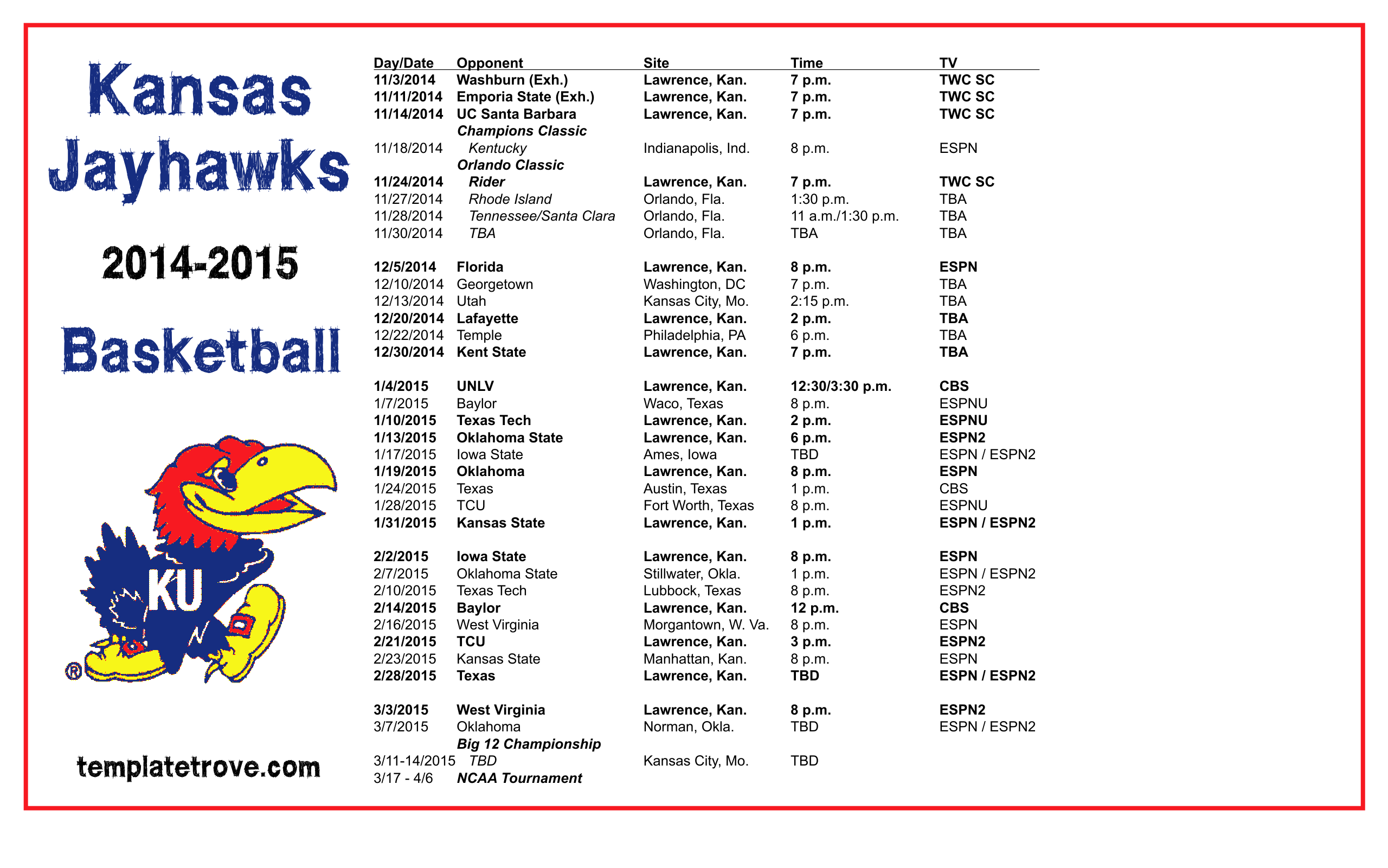 Ku MenS Basketball Schedule Printable