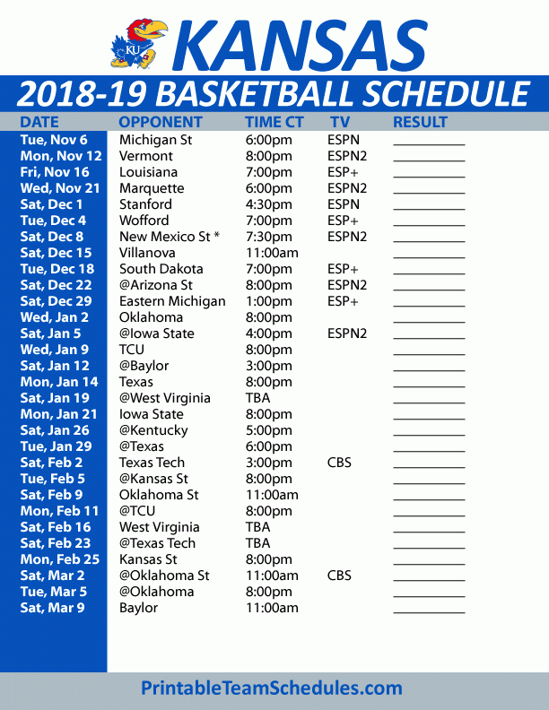 Printable 2018 2019 Kansas Jayhawks Basketball Schedule