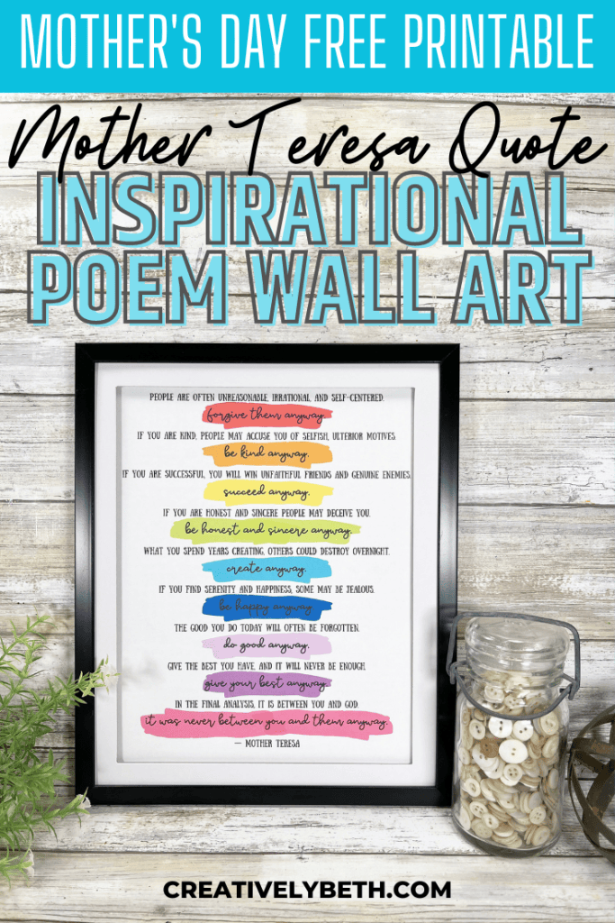 Whether you’re looking for a daily dose of motivation or simply love decorating with uplifting messages, this Mother Teresa “Do It Anyway” free printable is the perfect addition to your space. It serves as a constant reminder to keep pushing forward, no matter the challenges that come your way.