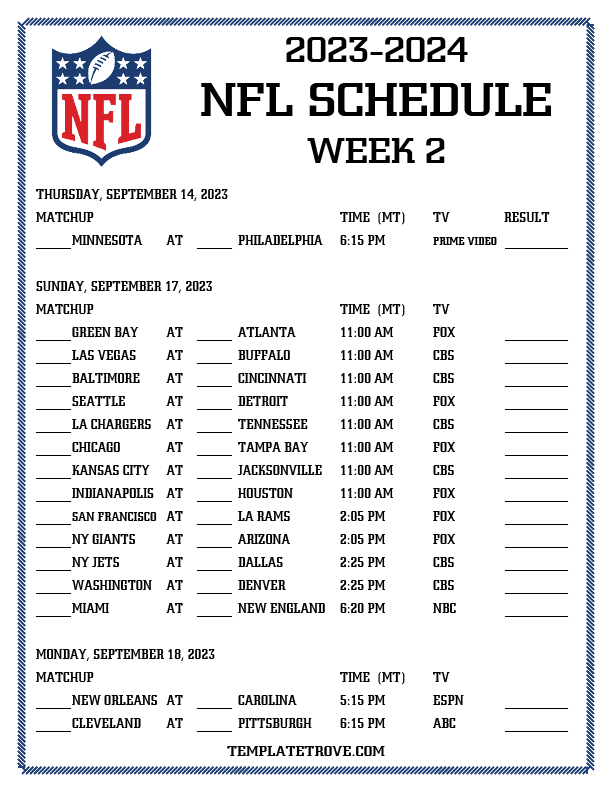 So don’t wait any longer – print out your NFL Week 2 schedule today and get ready for a weekend filled with football, fun, and excitement. Whether you’re rooting for your hometown team or just looking to enjoy some great football, Week 2 is sure to deliver all the thrills and excitement you crave.