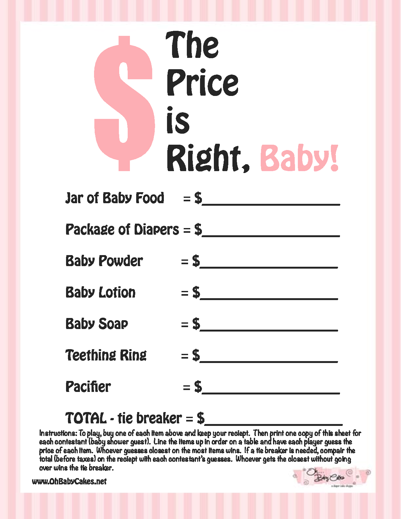 Price Is Right Baby Shower Game Template