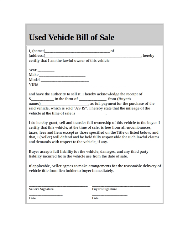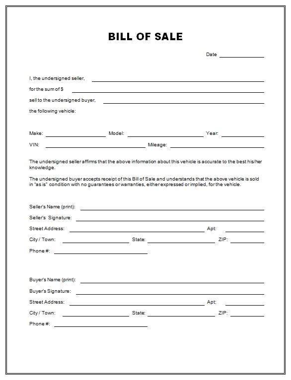 Generic Bill Of Sale Printable Used Car