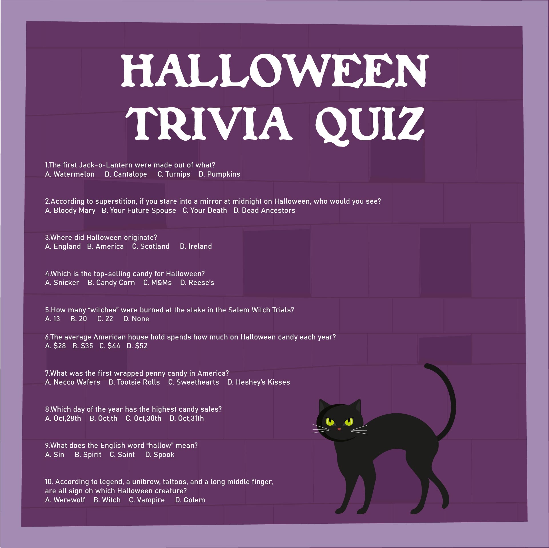 Whether you’re hosting a Halloween party or just want to test your knowledge of all things spooky, these trivia questions are perfect for any Halloween gathering. Simply print out the questions and answers, gather your guests, and let the fun begin!