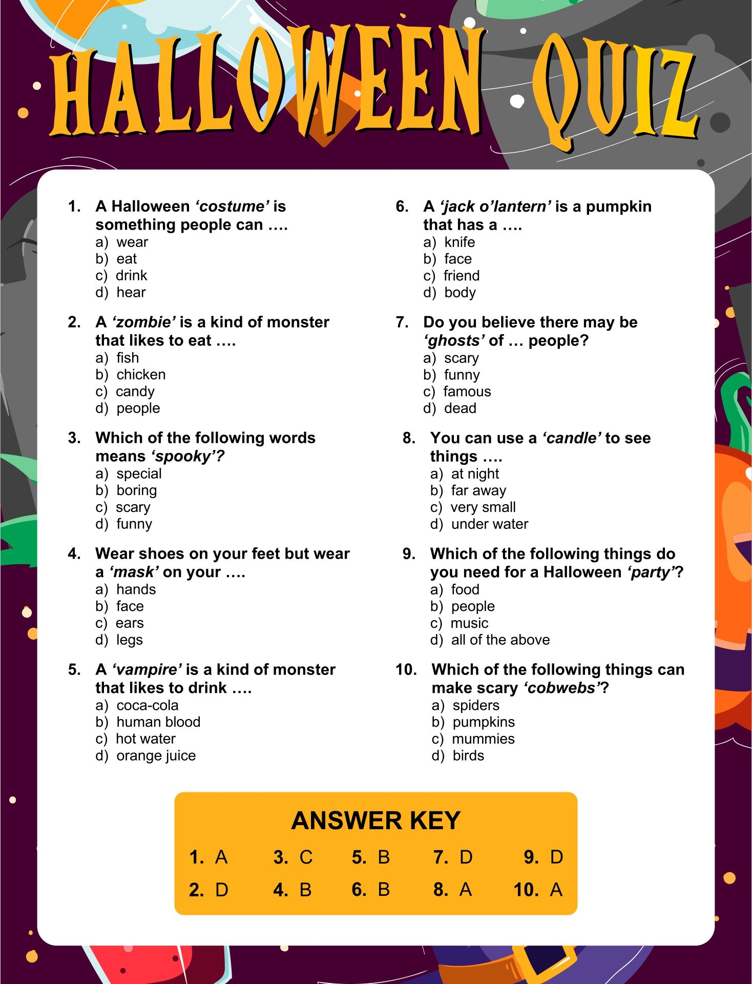 Don’t forget to add some spooky decorations, snacks, and drinks to set the mood for your Halloween trivia night. Whether you’re hosting a small gathering or a big party, these printable trivia questions and answers are sure to be a hit with all of your guests. Get ready for a night of fun, laughter, and maybe even a few scares!