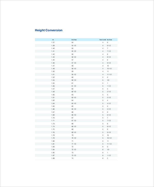 Printable Height Conversion Chart Inches To Feet Conversion Table