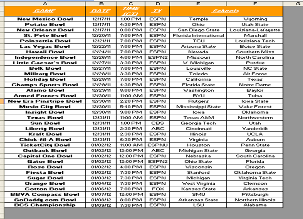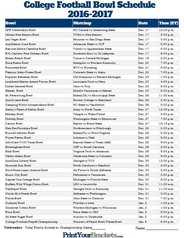 Printable Ncaa Football Bowl Schedule