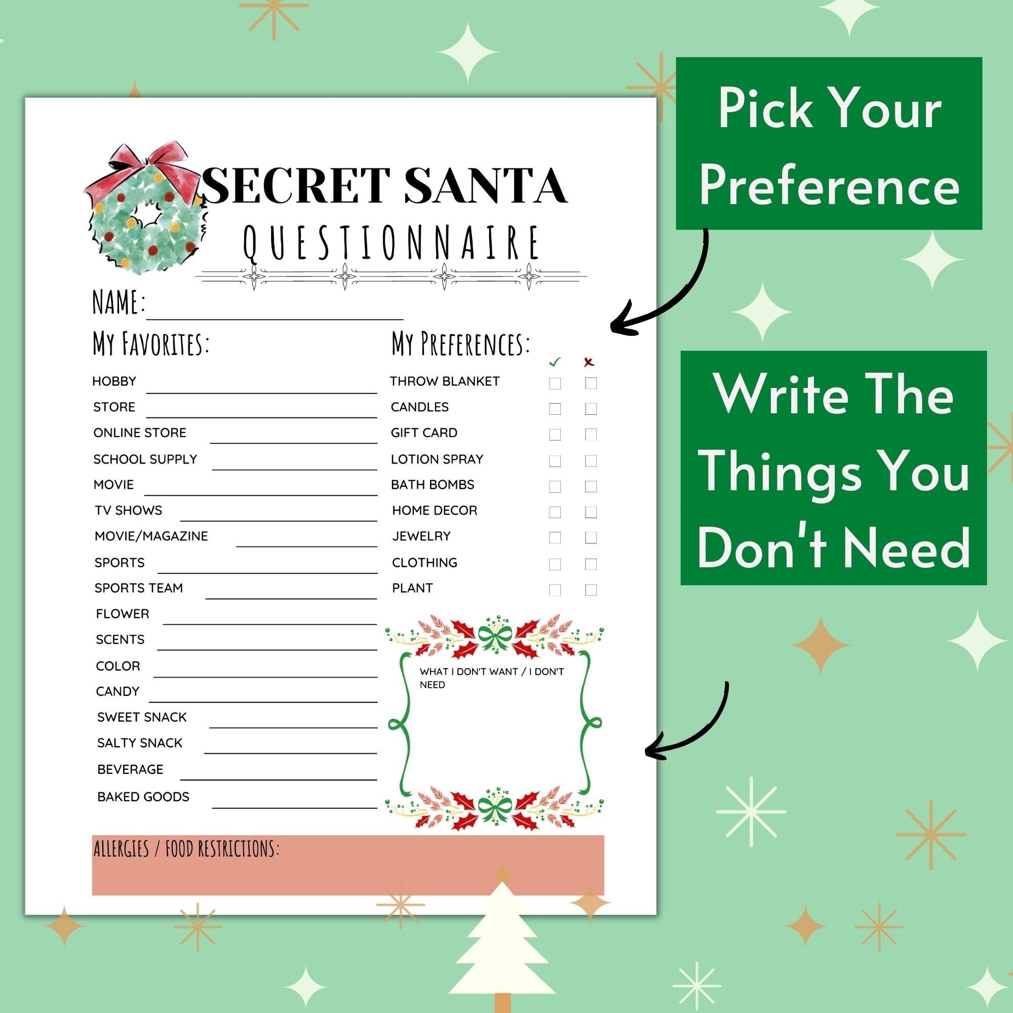 Printable Secret Santa Gift Exchange Questionnaire Christmas Secret