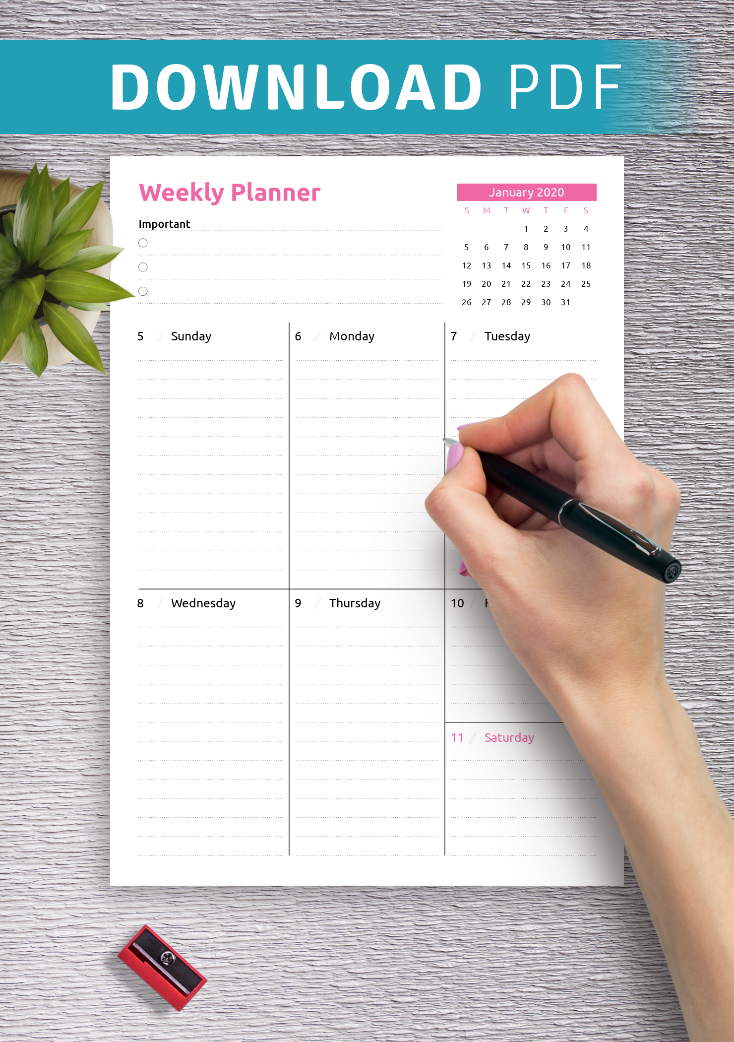 A5 Size Week On One Page Printable Undated Weekly Planner PDF Template